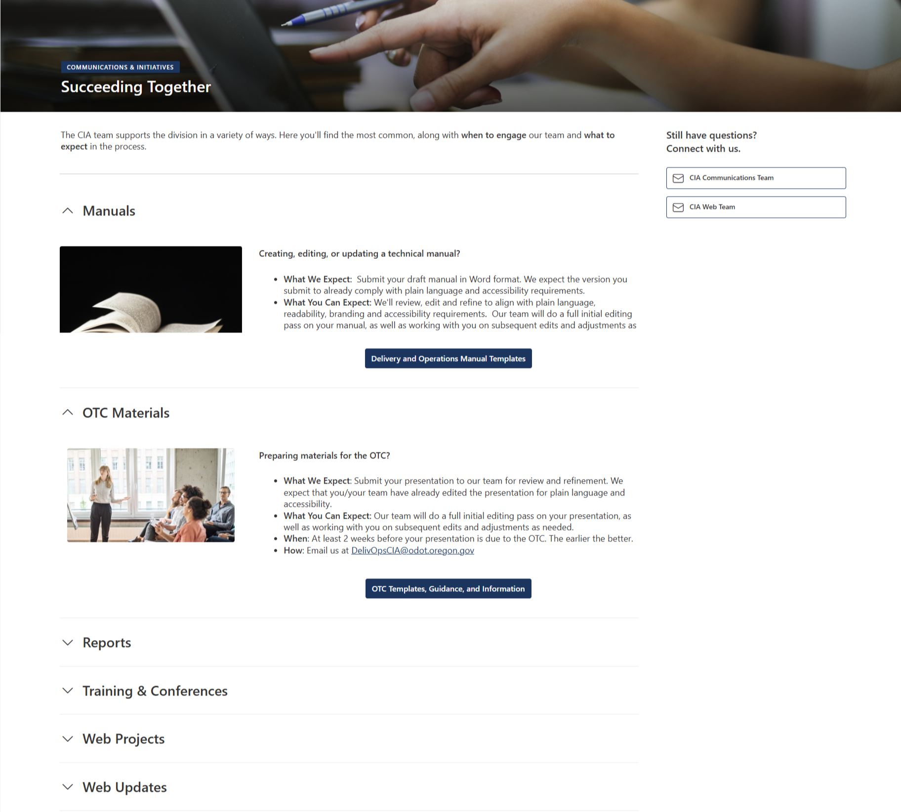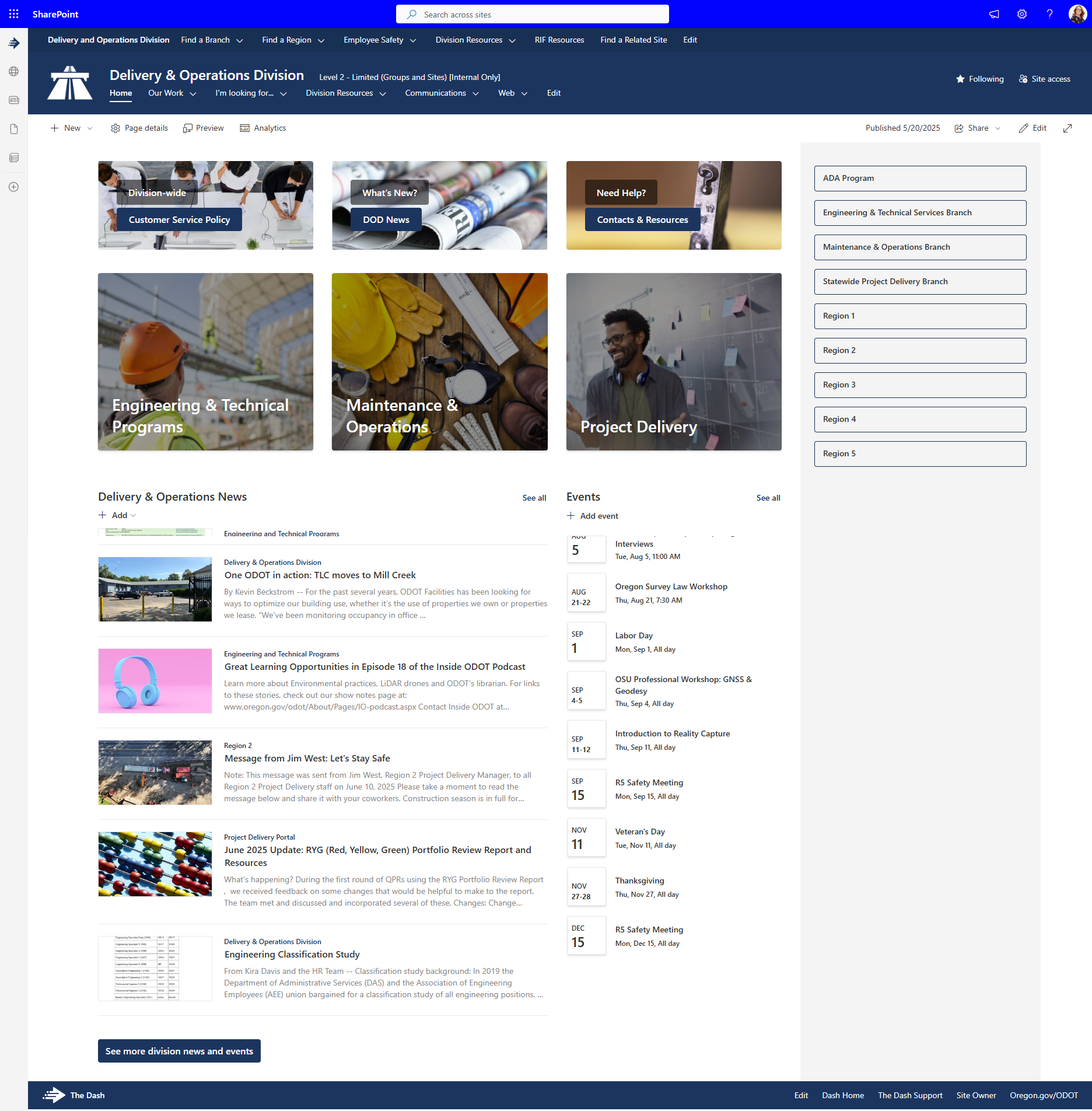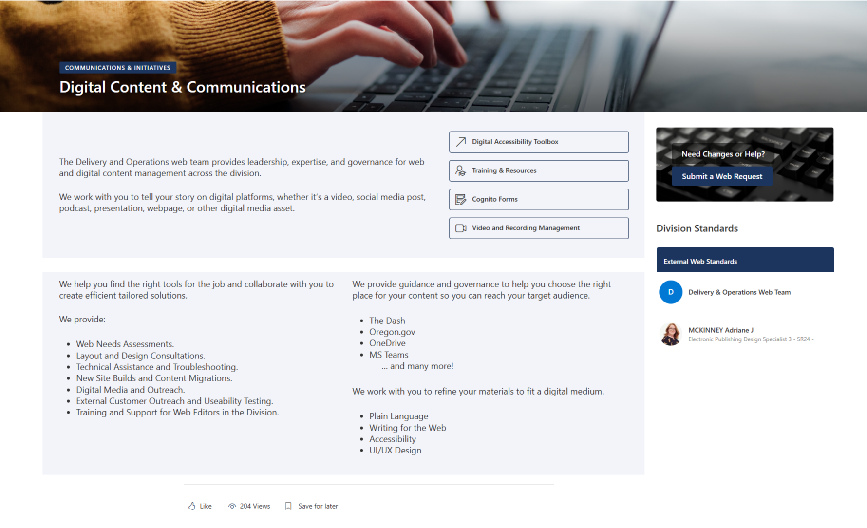 The following examples of my work were built in SharePoint 2016 on Prem within the Oregon.gov environment. Web-part selections are limited to a handful of custom-built web-parts provided by our contractor. Many of these pages are augmented with custom CSS I created to build better user interfaces and visual interest.