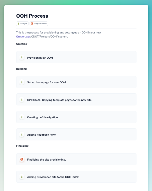 I collaborated with others in my team to put together a process and a system within our existing Oregon.gov/ODOT environment. The final process utilized multiple tools we already had access to which meant we had no additional costs. I automated many parts of the process to reduce personnel cost and ensure consistency. Since its launch in fall of 2024, community affairs coordinators have requested and built 40 sites to engage our customers around the state.