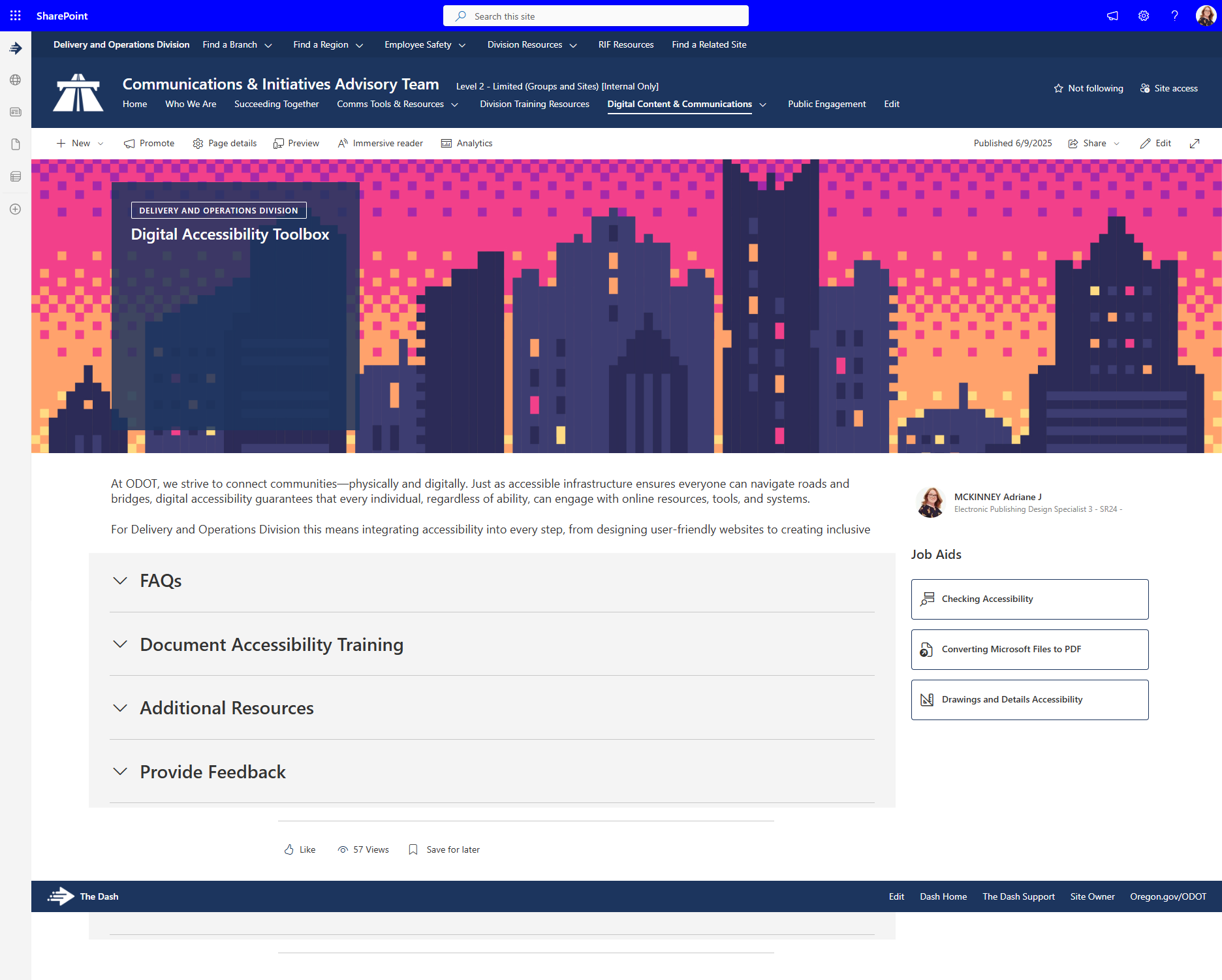 To address this need we took a two prong approach. First, I worked with our division training coordinator to get on-demand training and materials available for our colleagues. Secondly, I created a SharePoint Online site to serve as a one-stop-shop for all things accessibility.